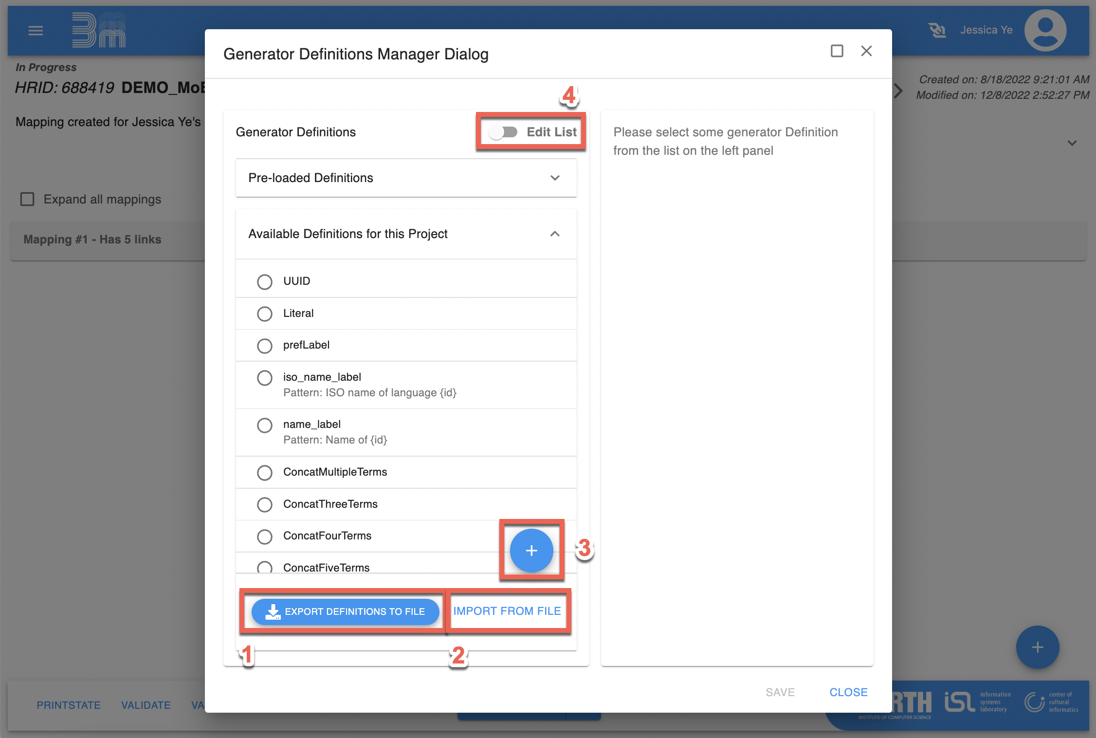 | Fenêtre Generator Definitions Manager Dialog avec des annotations. |