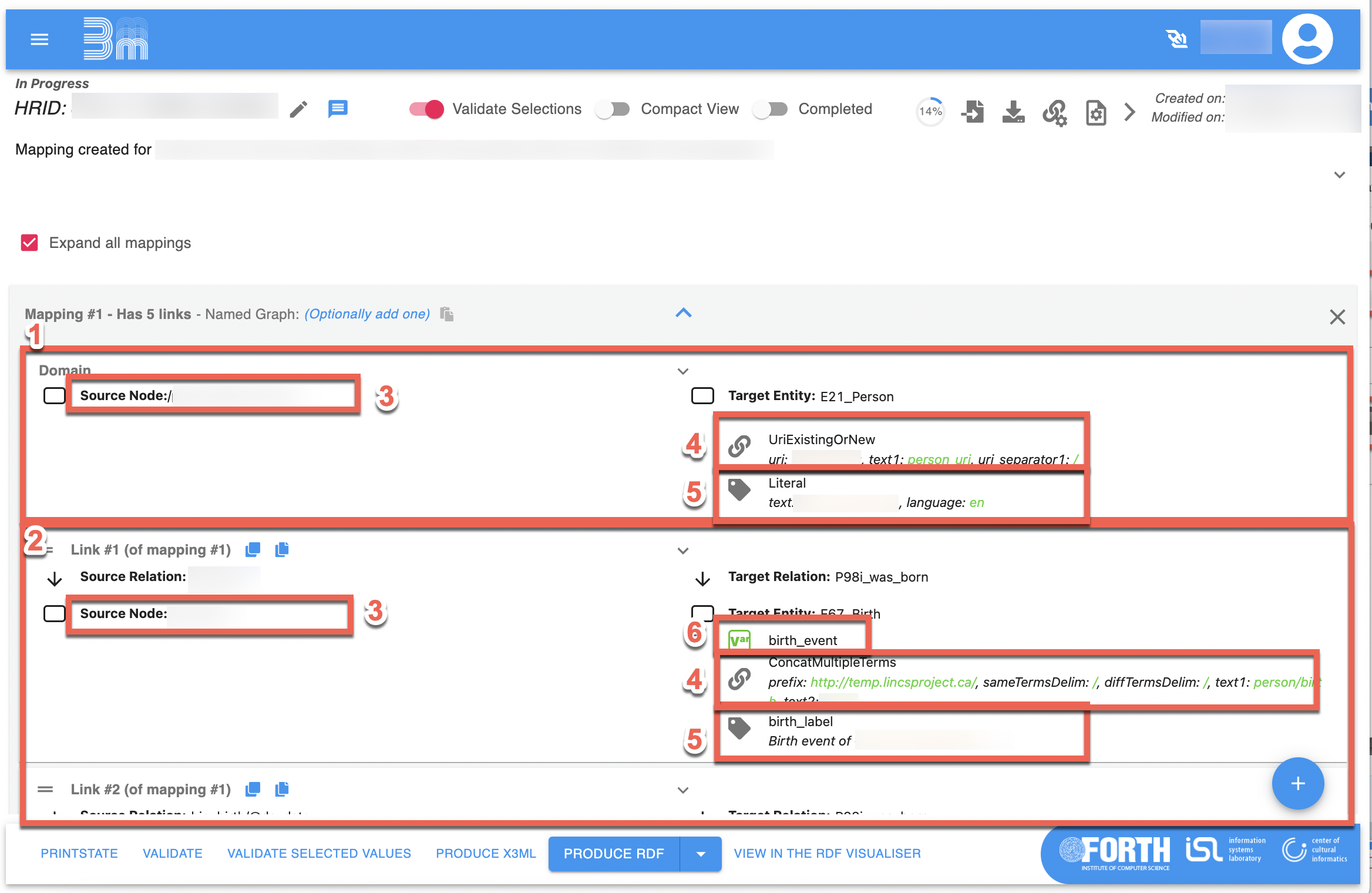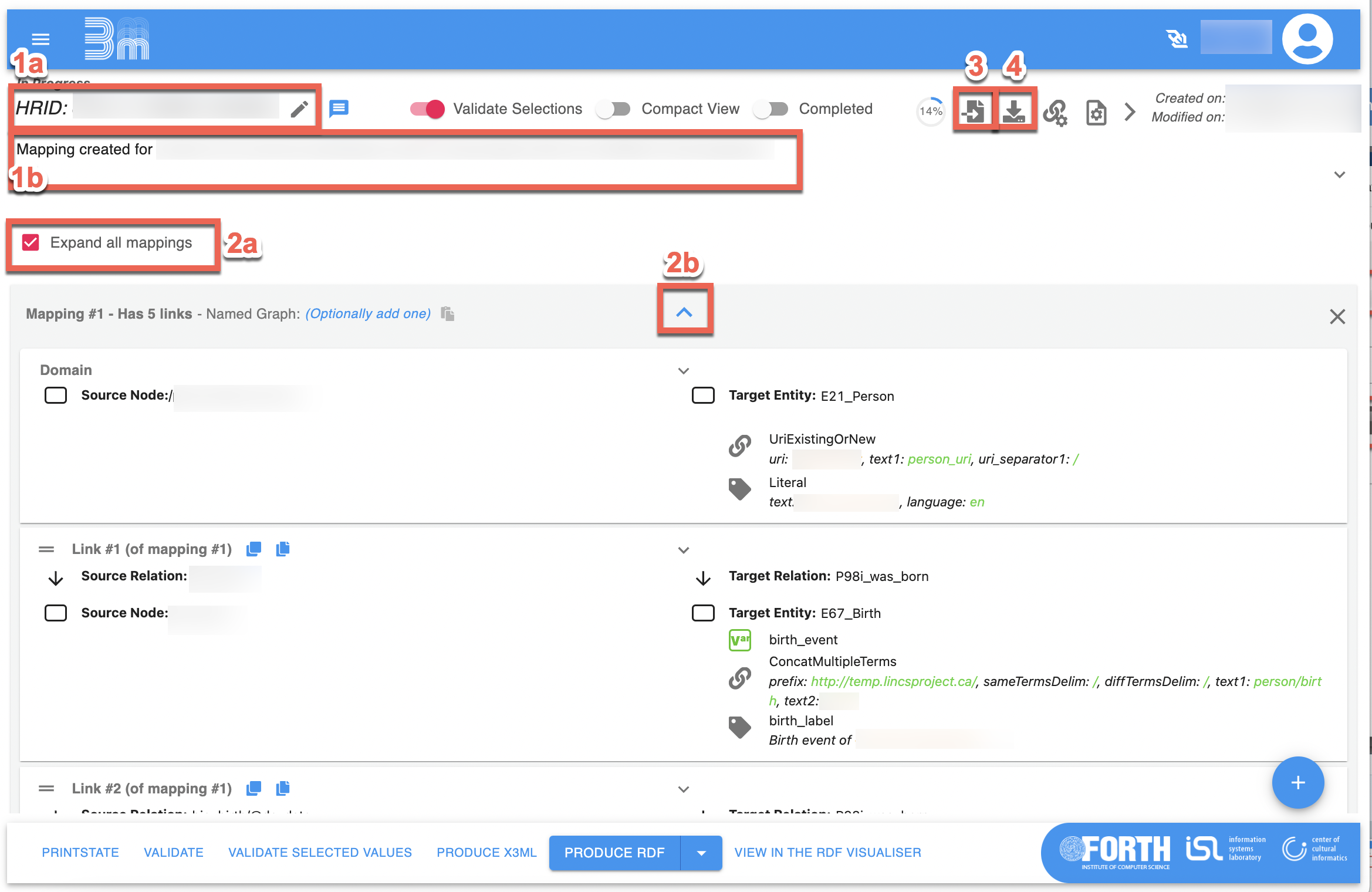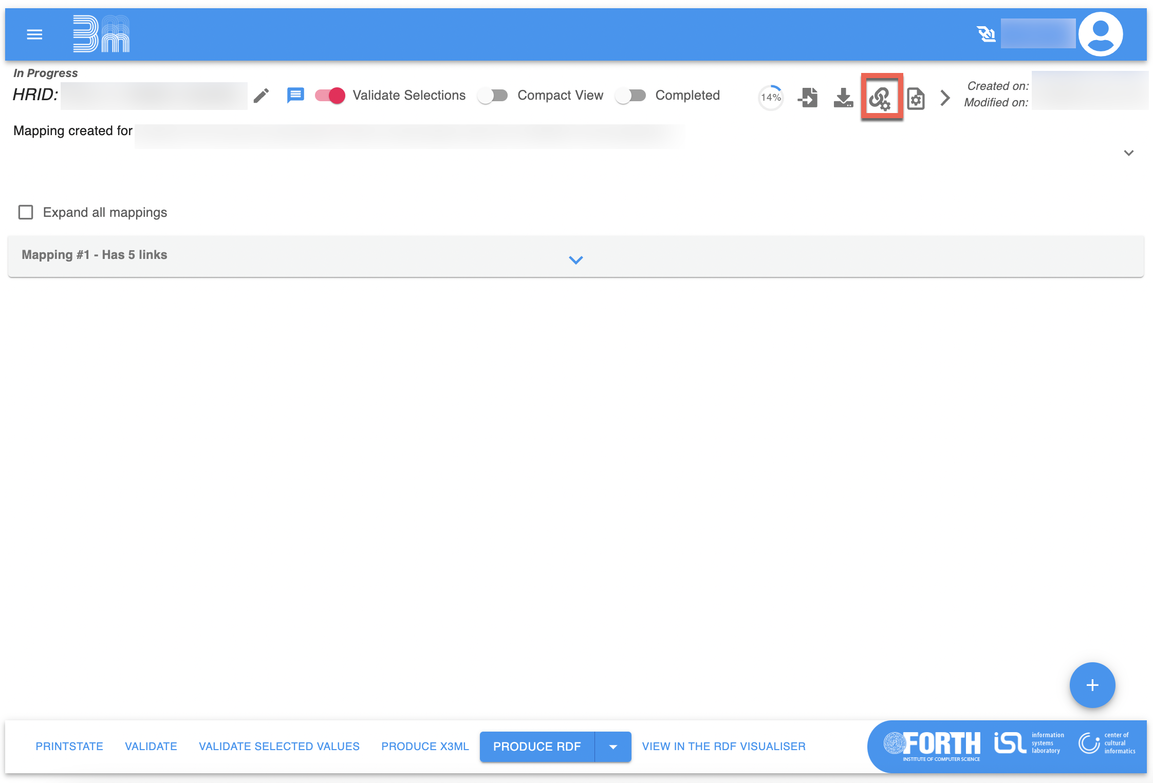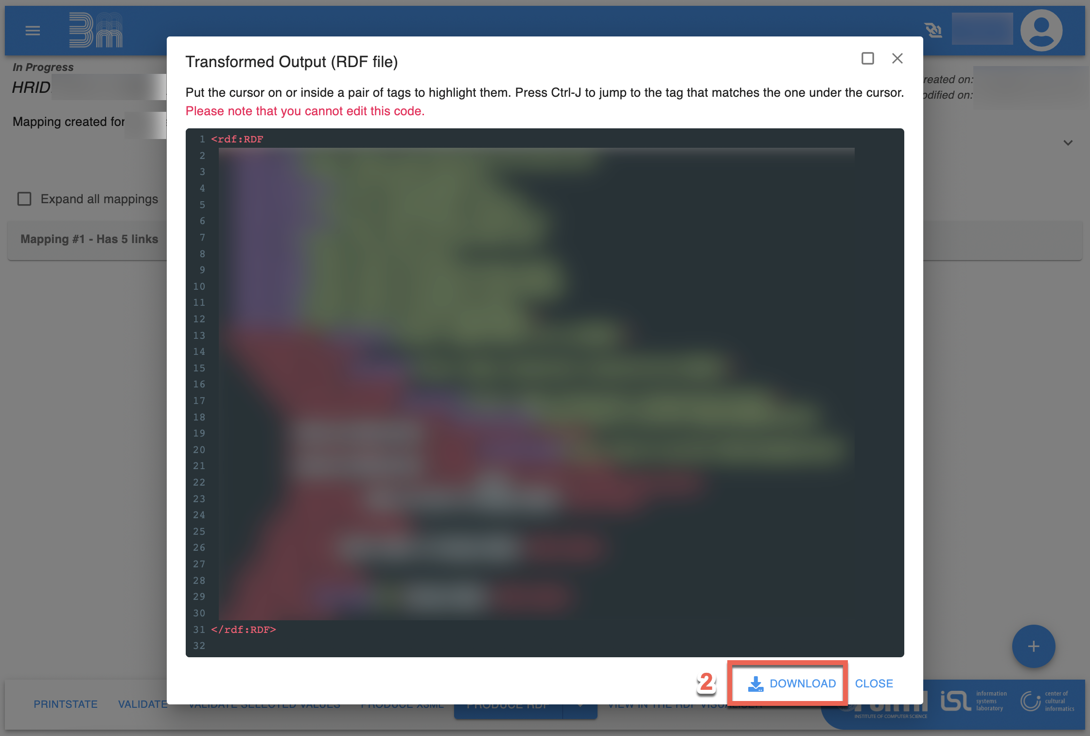 En bas de la page Mappings Overview se trouve le bouton Produce RDF. Le projet de mapping est automatiquement sauvegardé dans l'instance LINCS 3M. Pour sortir vos données converties de 3M, vous devez produire des données RDF.
