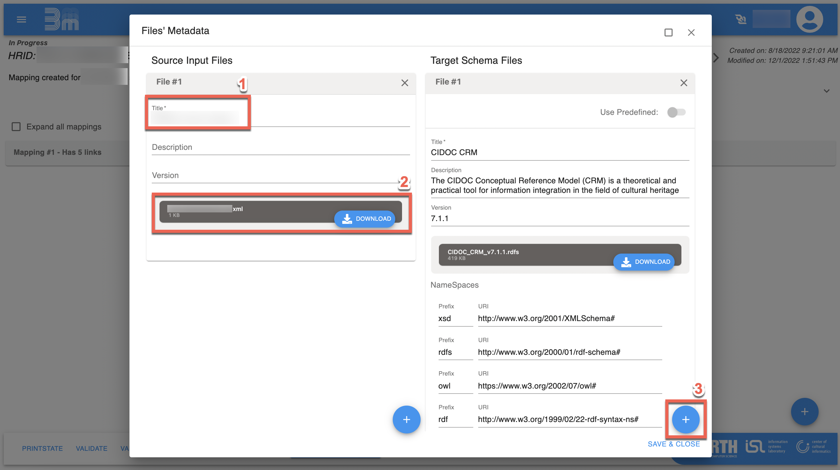 La fenêtre Gestion des métadonnées des fichiers s'affiche lorsque vous ouvrez un projet. Vous pouvez utiliser cette fenêtre pour spécifier les données que vous souhaitez convertir et les ontologies que les données converties doivent suivre.
